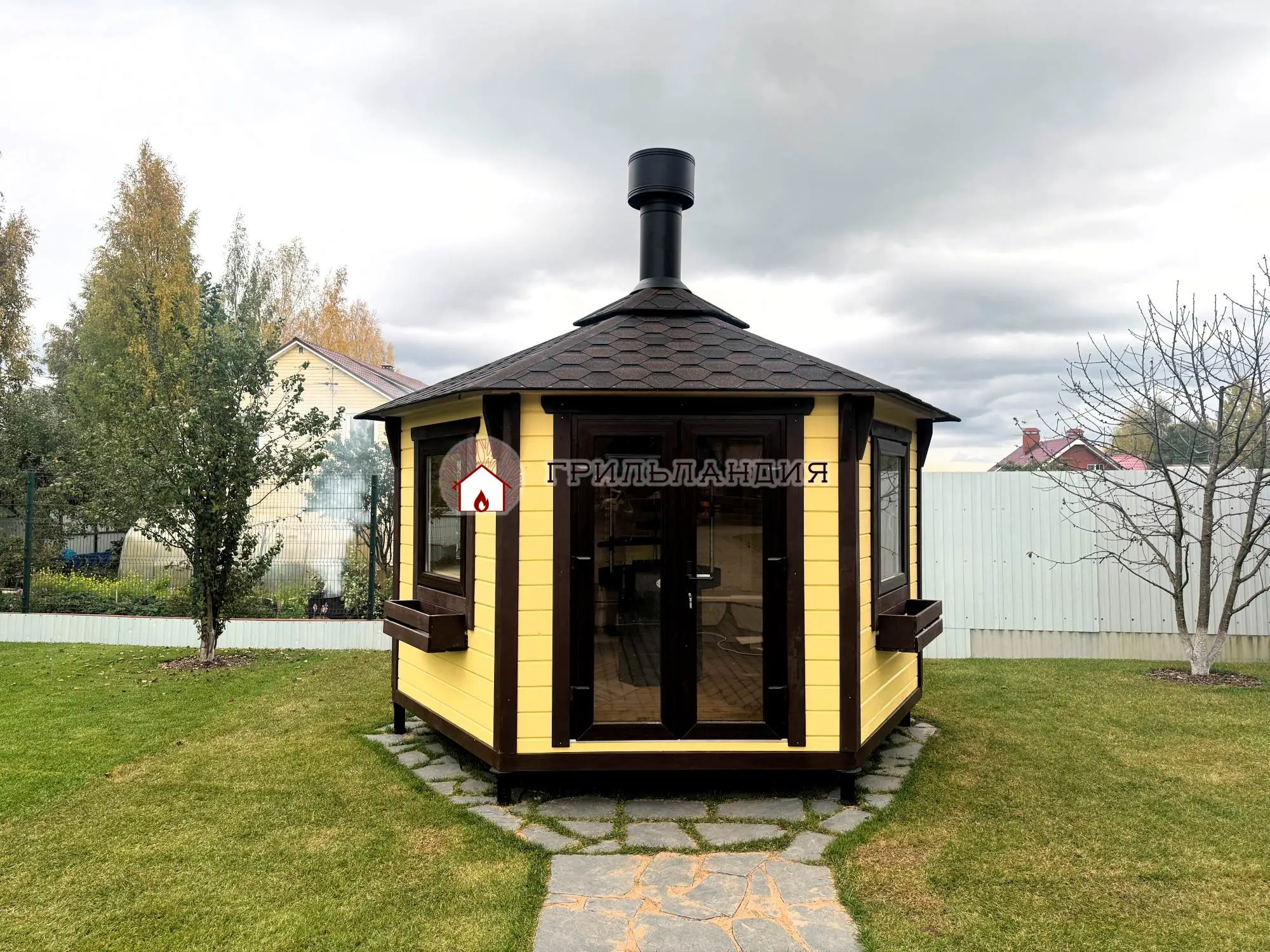 Что входит в стоимость?Беседка с грилем закрытого типа «Гриль-Хаус» 9м2 воплощение эстетики и практичности. Каждый элемент подчеркивает декоративное преимущество этого изделия: фигурные балясины-подпорки для свесов крыши, наличники на стеклах окон и дверей, филенки на дверях, ящики для цветов, внутренние полки над окнами и т.д. Наш стиль – детали.