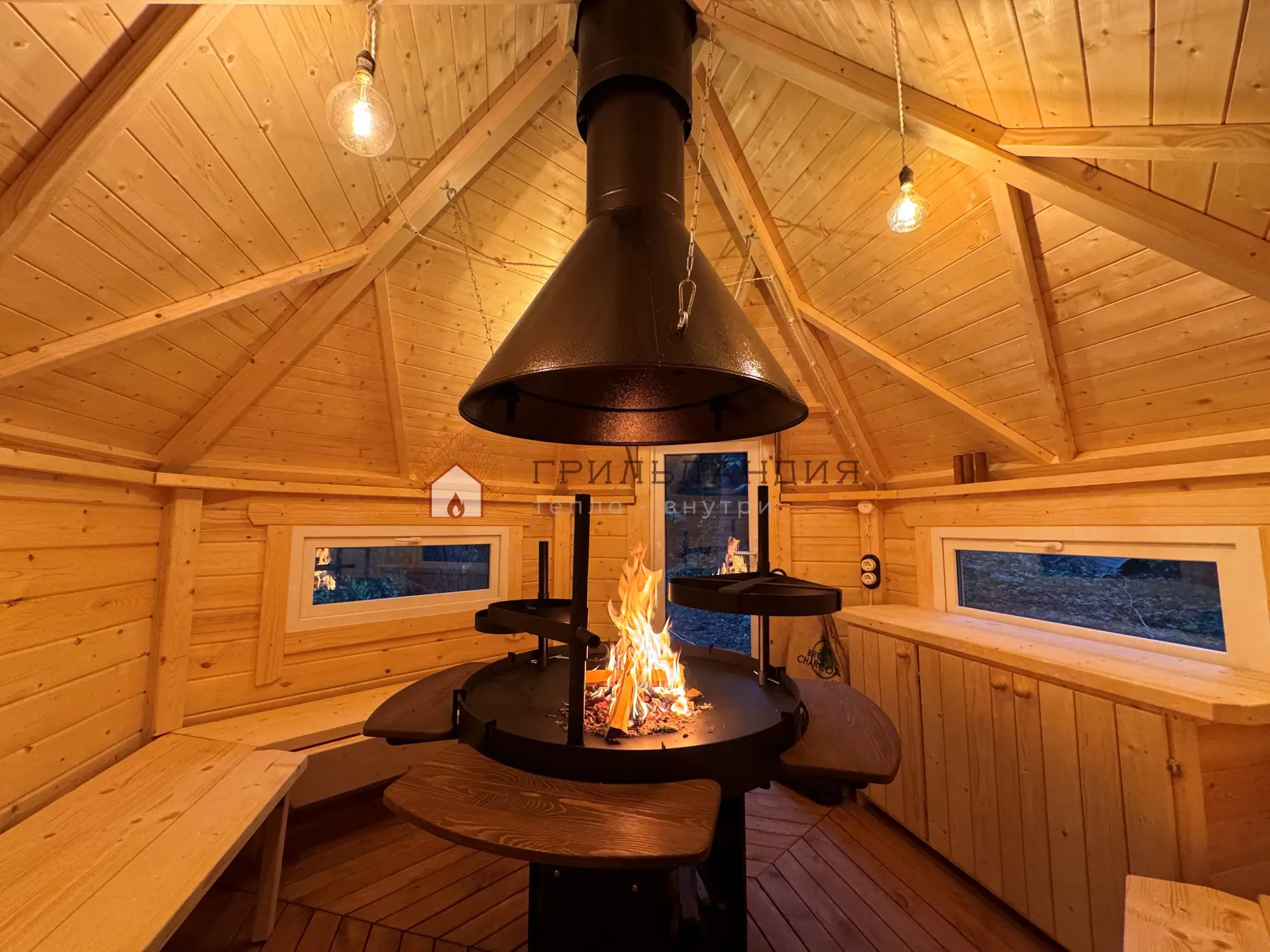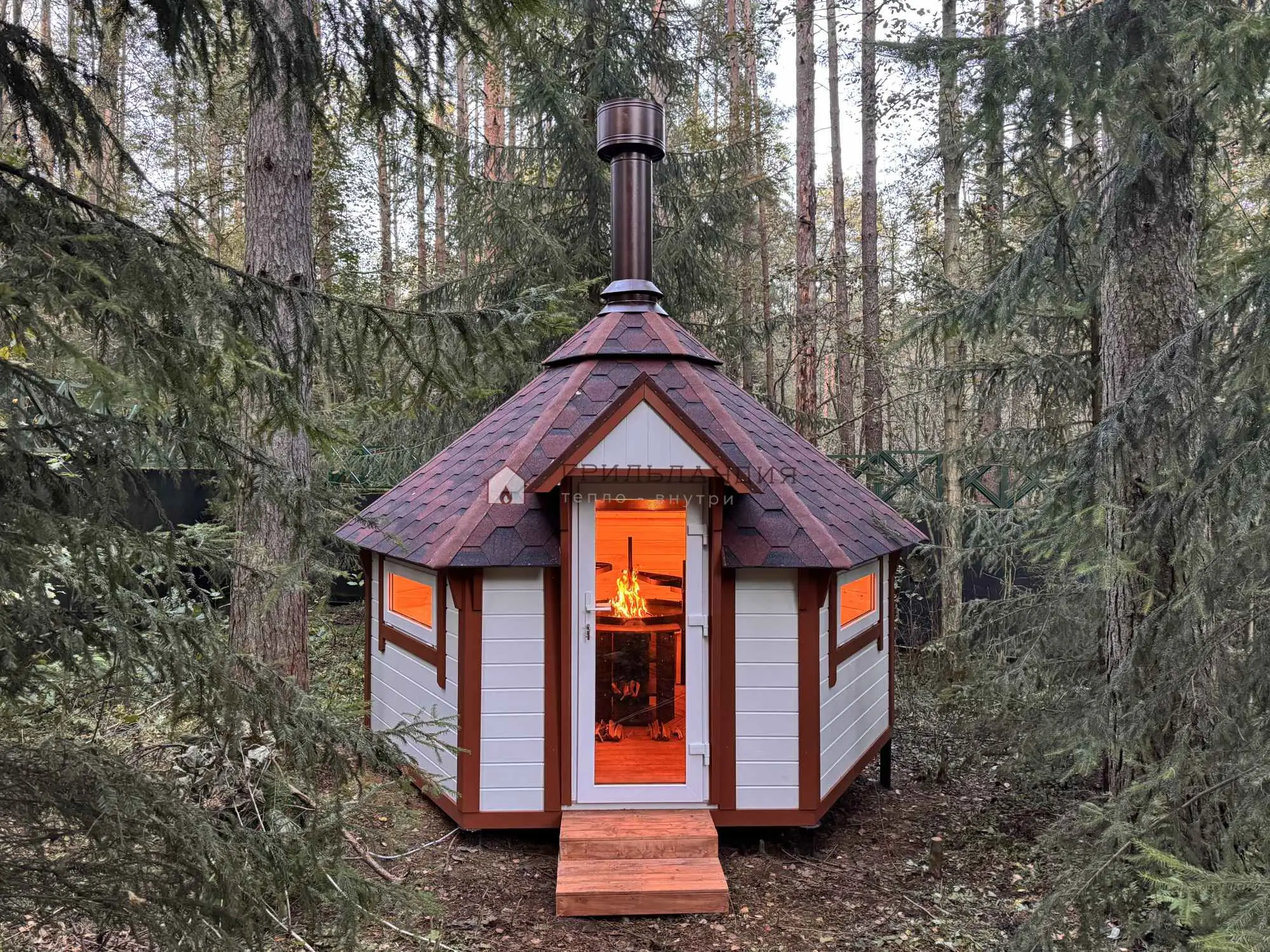 Что входит в стоимость?Небольшой гриль-домик 9.2 м2 комфортно разместит до 12 человек. Стеновой материал, окна-стеклопакеты, качественный кровельный пирог создают низкую теплопроводность, что позволит в зимнее время быстро прогреть домик. Окна и дверь имеют декоративную отделку стеклопакетов, что придает сказочного шарма. Свод потолка обивается вагонкой Soft Line и декорирован бруском.